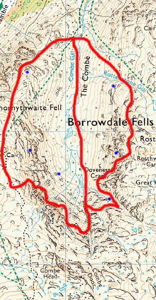 Borrowdale Valley Keswick - Coombe Gill - working the ground south from the start of the Coombe and east of the beck - to the skyline all the way through the crags then underneath Raven Crag to the far southern end where the steep gill runs. (Area took about 2 hours) half an hours rest then the opposite side of Coombe Gill - same sort of thing.